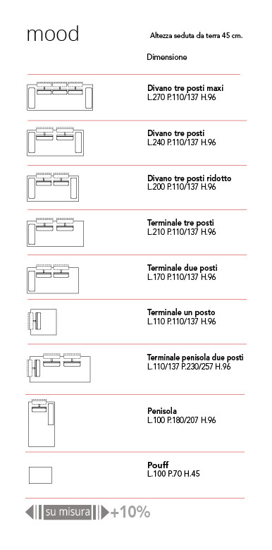 mood scheda Segnala ad un amico Richiedi informazioni Divano completamente sfoderabile, componibile, schienali con regolazione di profondità, struttura in legno massello e agglomerato, cinghie elastiche, imbottiture in poliuretano espanso indeformabile.